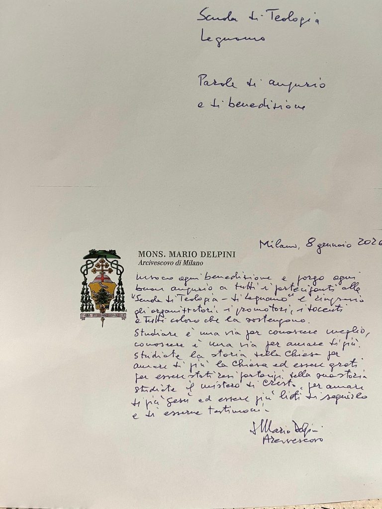“Invoco ogni benedizione e porgo ogni buon augurio a tutti partecipanti alla “Scuola di Teologia di Legnano” e ringrazio gli organizzatori, i promotori, i docenti e tutti coloro che la sostengono.